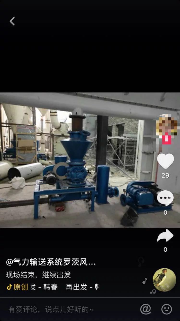 朋友圈配圖確為王經理在抖音發的一個濰坊的客戶反饋回來的視頻,輸送鈣粉的真實案例,運行正常,客戶表示滿意。