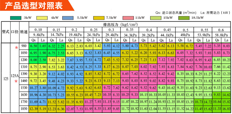 具體羅茨風(fēng)機(jī)參數(shù)選型表如下: